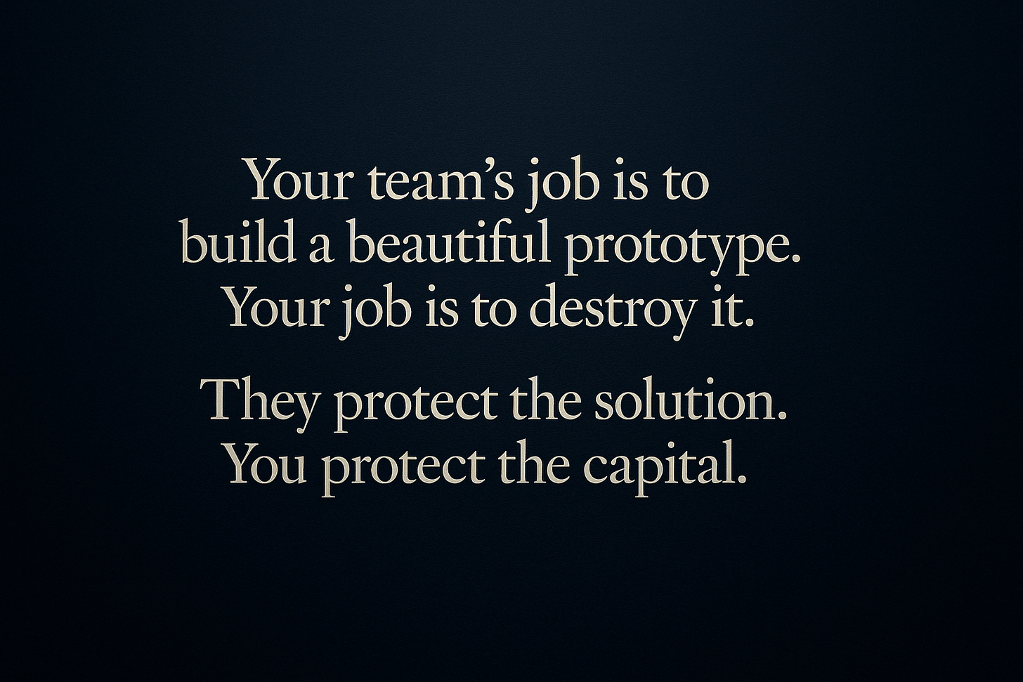 All of this happens before you write a single line of code. Before you risk a single dollar of your capital on a beautiful, beloved, and completely wrong solution.